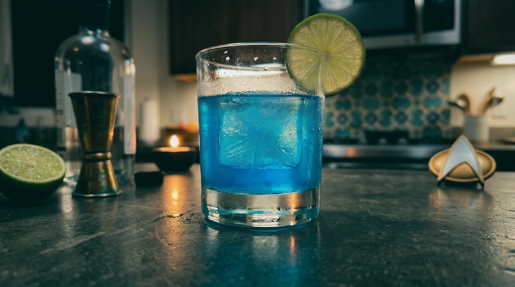 Blue curaçao handles the color — and before you say anything, yes, I tried butterfly pea flower tea first. Everyone suggests it. I get the appeal: natural, pH-reactive, Instagram-friendly. But it wasn’t blue enough. Butterfly pea flower gives you a purple-leaning lavender in most cocktail contexts, especially with citrus, and the color shifts unpredictably depending on the acidity of your lemon juice. Romulan Ale isn’t subtle blue. It’s audacious blue. It’s blue that gets stopped at customs. Blue curaçao — specifically Senior’s original, if you can get it — gets you there without the guesswork.
